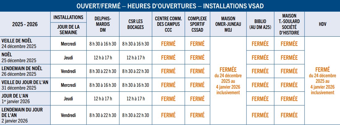 ACTUALITÉS Horaire des Fêtes 2025 23 décembre 2025 Nous vous invitons à consulter l'horaire des Fêtes de nos installations avant de vous déplacer. Cliquez sur l'image pour l'agrandir. Joyeuses Fêtes !